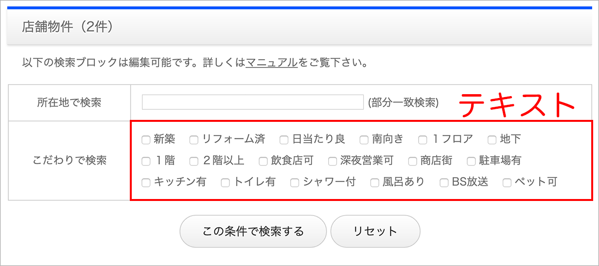 「こだわりで検索」ブロックは、アイコン画像またはテキストで表示できます。