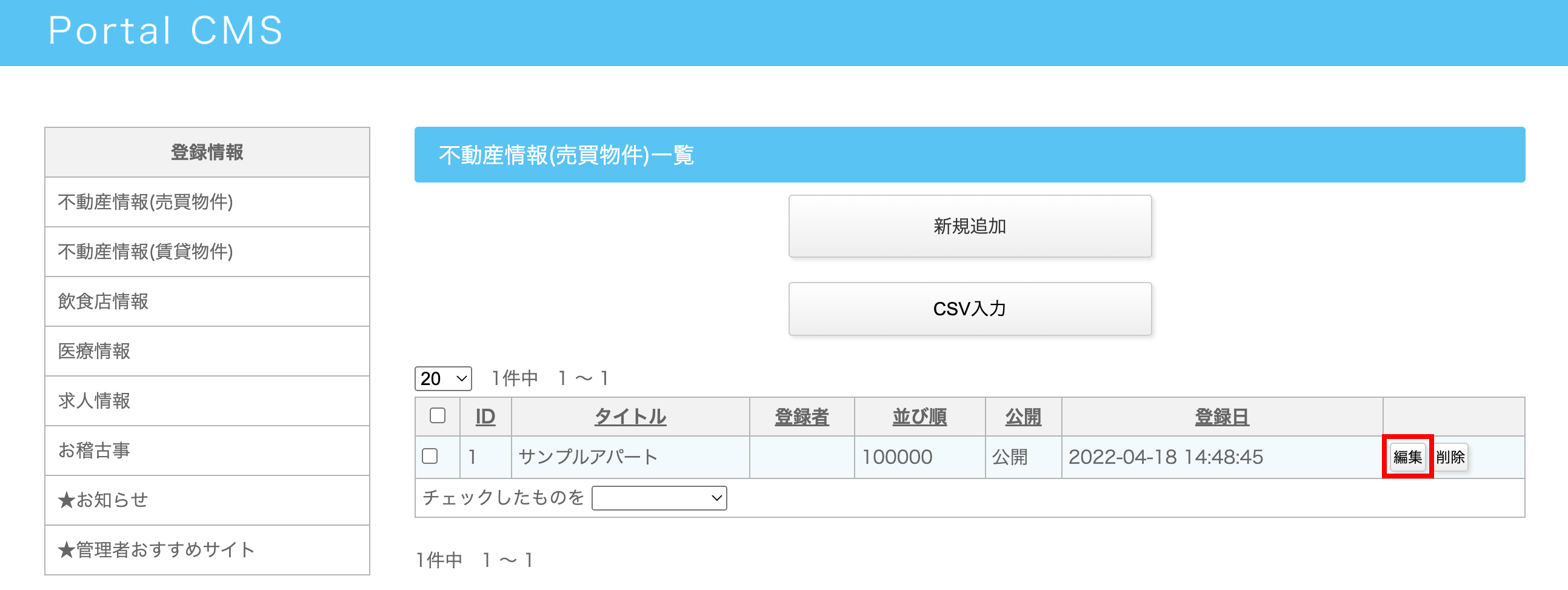 - 任意のカテゴリーメニューを選んだら「CSV入力」をクリックします。
