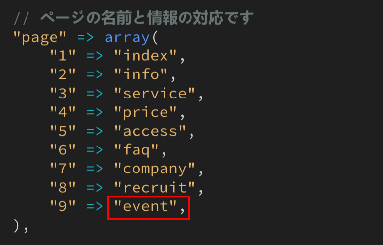 今回使っているテンプレートのメインメニューは6個構成なので、「ホーム」を外し、代わりに今回追加する「イベント」を追加する事にしました。